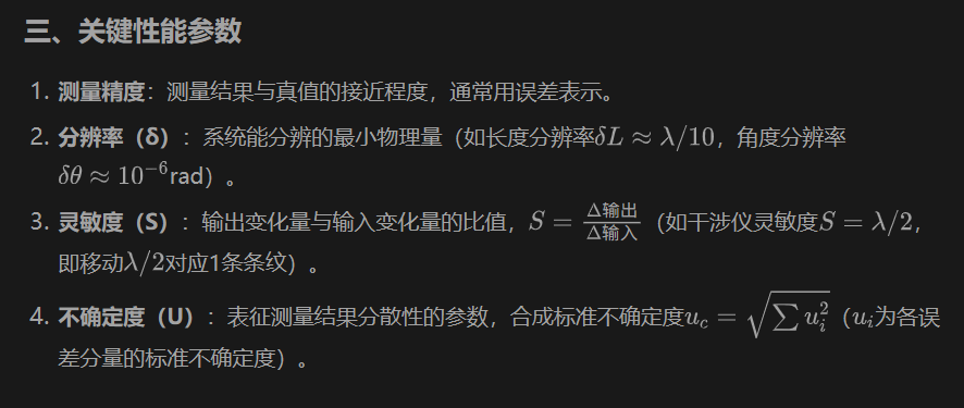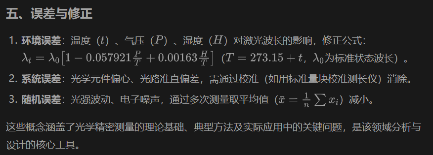 以下是光学精密测量领域的核心概念及公式(用$标记),涵盖基础原理、典型测量参数。