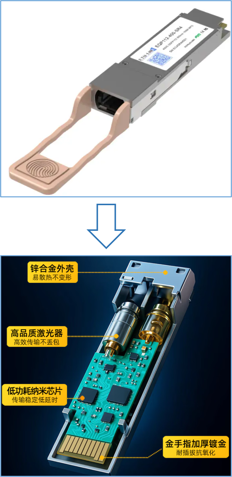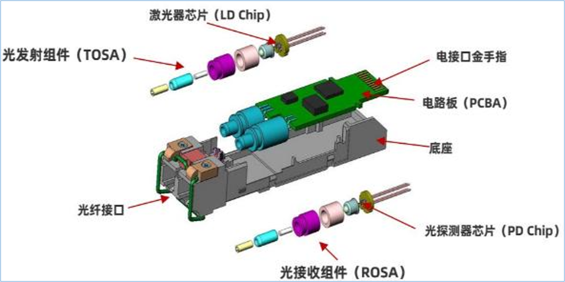 光收发模块由四大部分组成:分别是光电器件(光发射组件TOSA、光接收组件ROSA)、贴有电子元器件的电路板PCBA、光纤收发接口和底座。