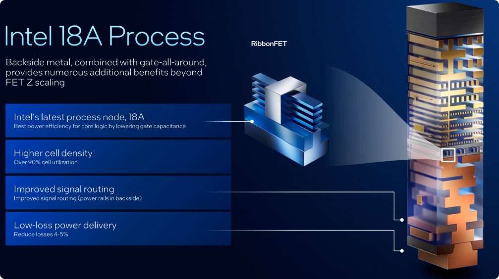 作为英特尔IDM 2.0战略下的关键节点,Intel 18A被视为该公司迄今为止大规模生产的最先进工艺技术。其名称中的“18A”指代1.8纳米级的特征尺寸,标志着晶体管与互连结构在微缩层面达到了新的高度。这一工艺首次全面引入了名为RibbonFET的全环绕栅极(GAA)晶体管架构,并集成了业界首个名为PowerVia的背面供电网络(BSPDN),代表了半导体制造领域的重要革新。